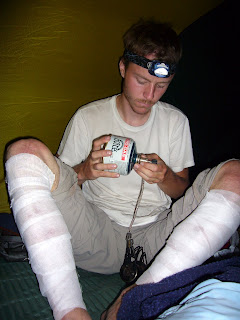 Eirik suffers from a sunburn with blisters on both his shinbones which was so bad that he had to but a bandage on.